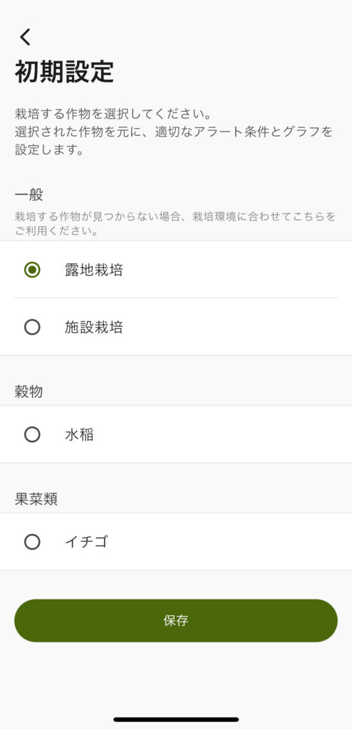 「初期設定をする」をタップしますと作物区分の選択画面になりますので
