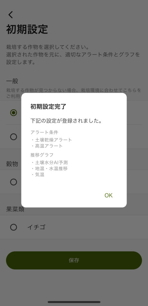 こちらのフィールド(センサー)で管理する作物を選択し保存を押してください。